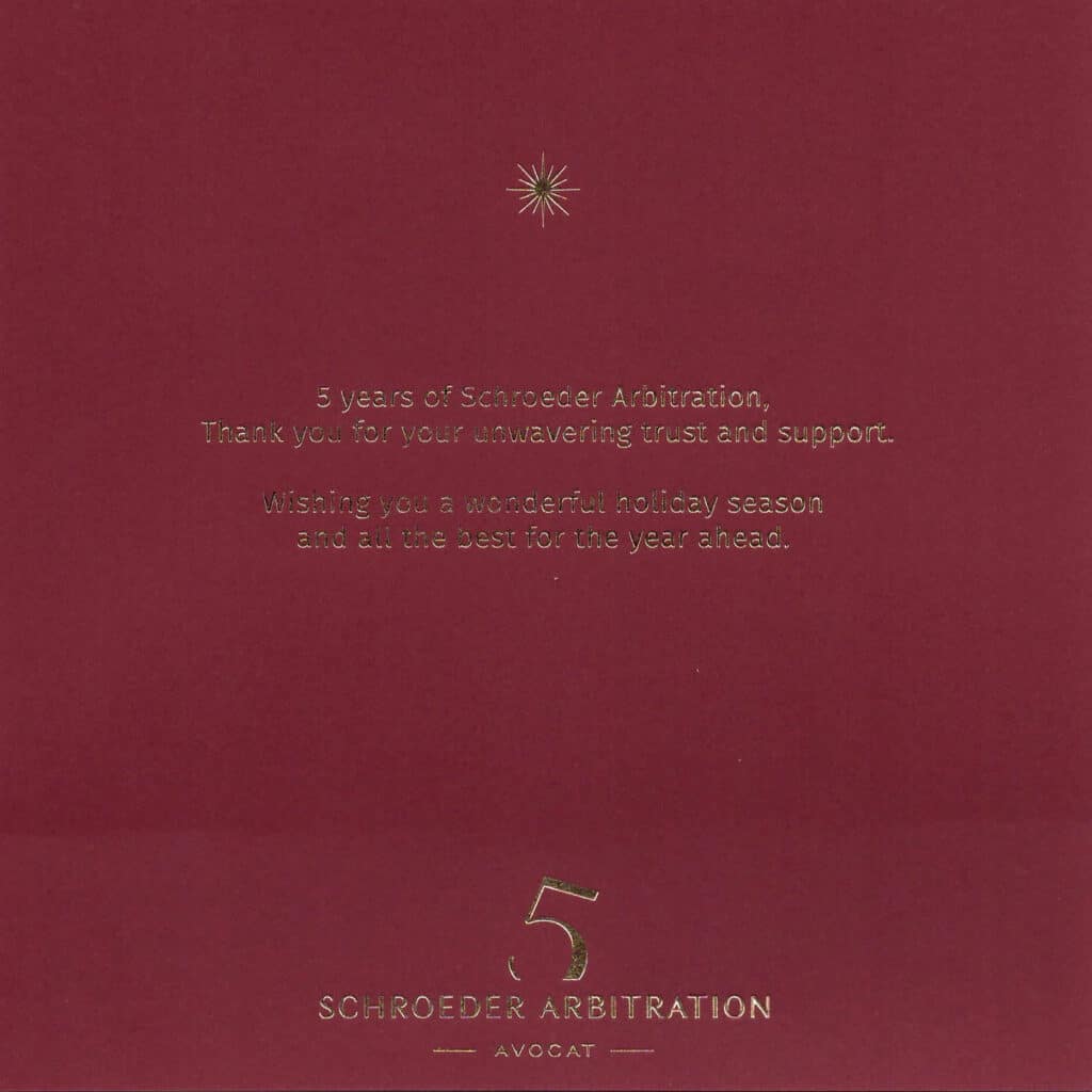 Création de la carte de Vœux 2026 qui fête les 5 ans du cabinet d’avocat Scroeder Arbitration
